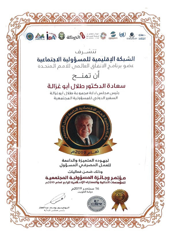 الكويت – منحت الشبكة الإقليمية للمسؤولية الاجتماعية سعادة الدكتور طلال أبوغزاله جائزة شخصية العام الاقتصادية الداعمة للعمل المصرفي الإسلامي لعام 2019.